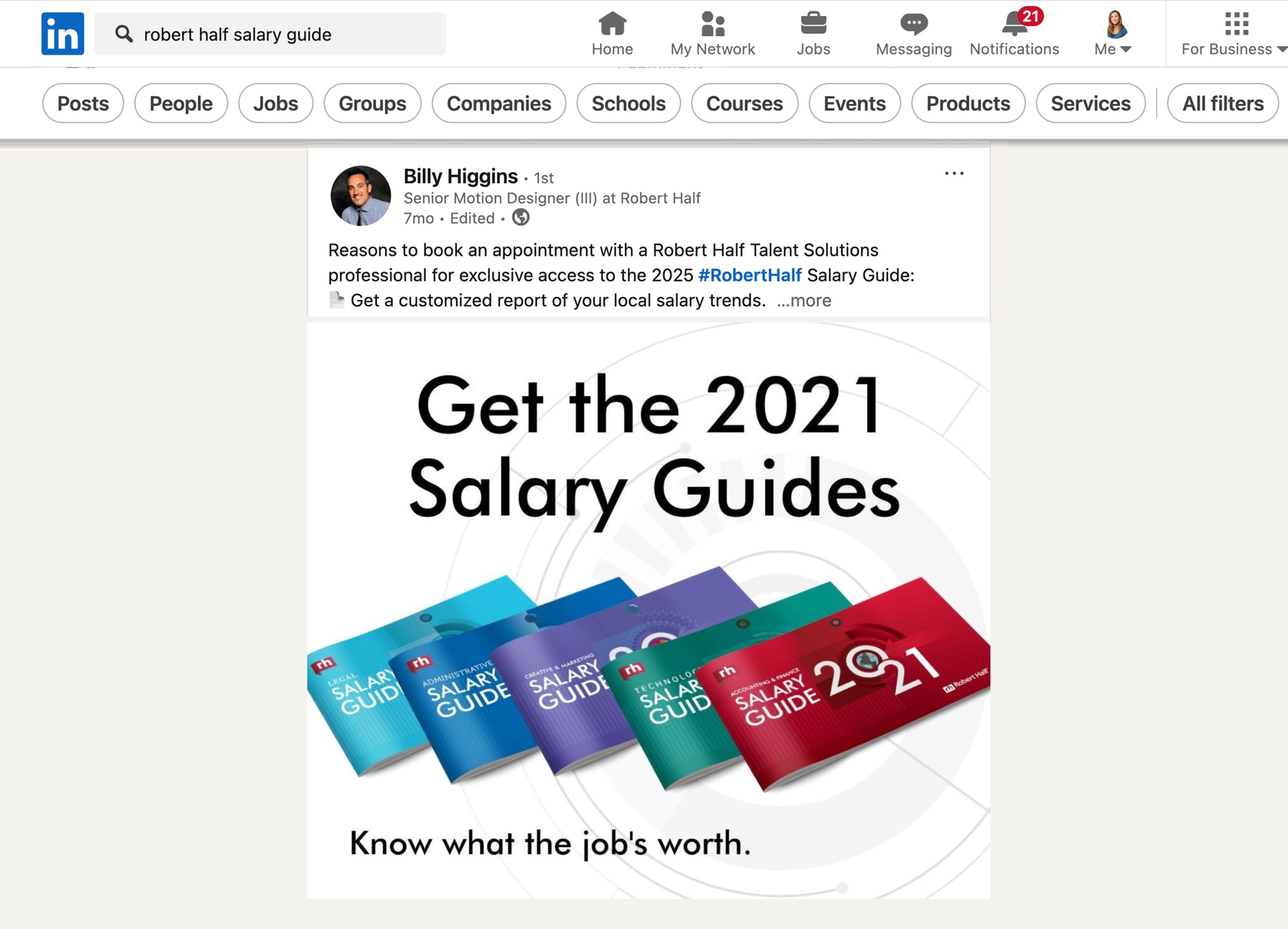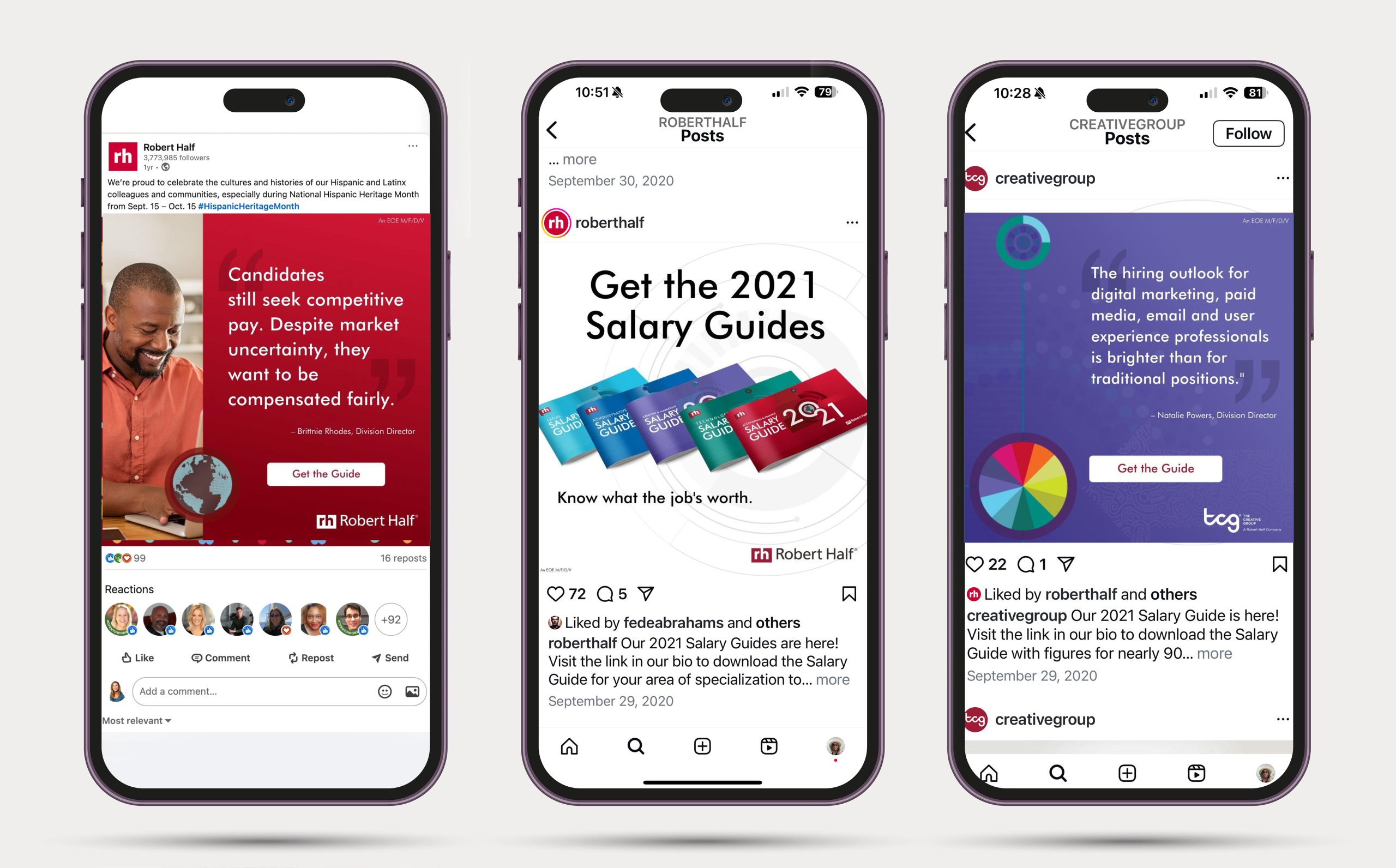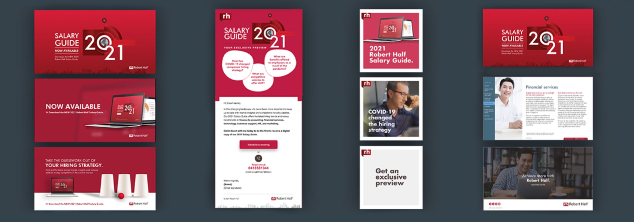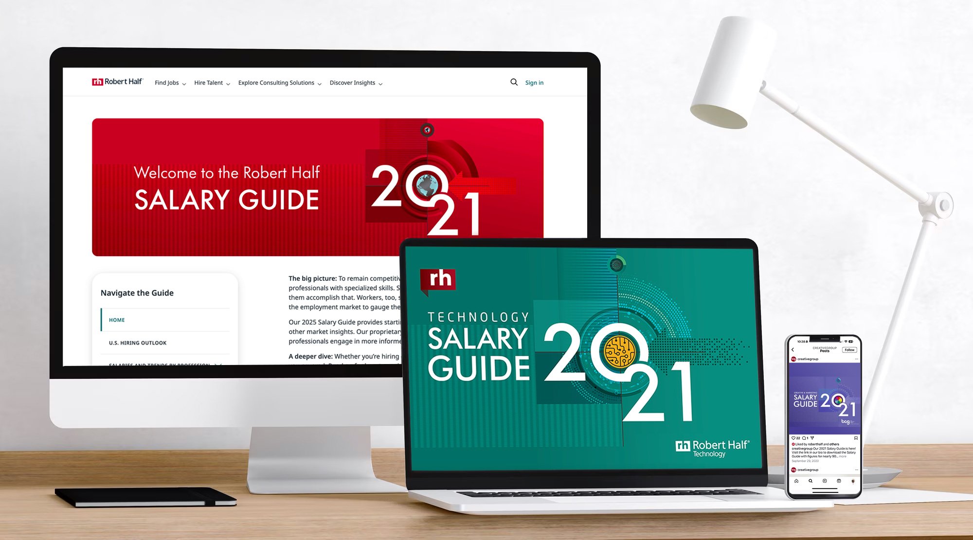 The Robert Half Salary Guide provides up-to-date insights on salaries, hiring trends, and benefits across a variety of industries. The team was tasked with creating separate guides for each branch of the business—including finance, tech, marketing, legal, creative and marketing, and administrative fields—making it a valuable resource for both employers and job seekers. The visual system was adapted across digital platforms such as the website, client portals, presentations, and social media.